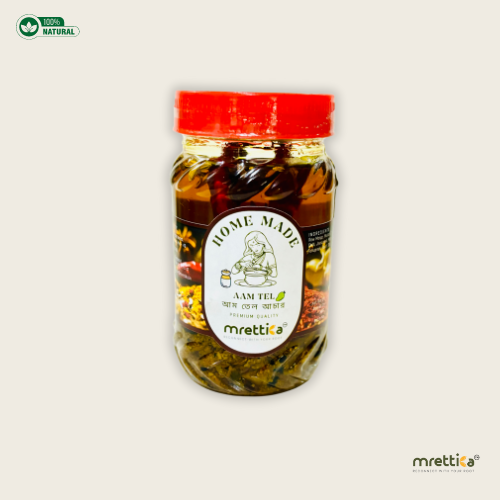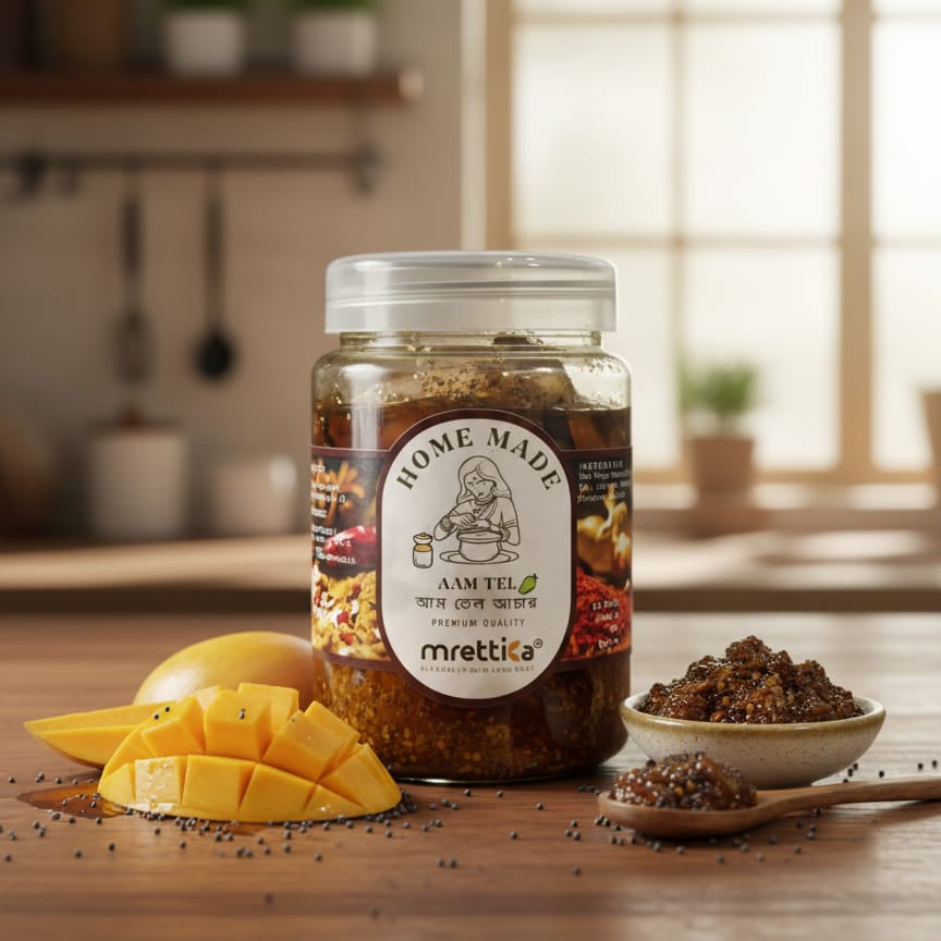 The bold and flavourful Aam Tel chiefly consists of the ingredients in its name- aam, or mango, and tel, or oil. The magic elements are the spices. Condiments, like panch phoron, dry chilli powder, asafoetida, salt, and turmeric, find their way into the preparation. These altogether act as the preservatives. Here at Polli Gram, we rely on the recipe handed down by generations of mothers, grandmothers or great-grandmothers. So, our Aam Tel does not contain any chemical preservatives. It only packs the love and care of those women.