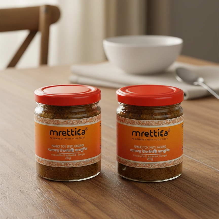 It is the heart of a Bengali home where mustard oil sizzles and the air smells of roasted spices. There lives a quiet ritual! Maa and Dida are sitting by the window, slicing mangoes with practised ease, whispering secrets over steaming cups of cha. That’s where Aamer Tak-Misti Kasundi was born—not in a factory, but in the loving hands of women who turned green mangoes into magic.